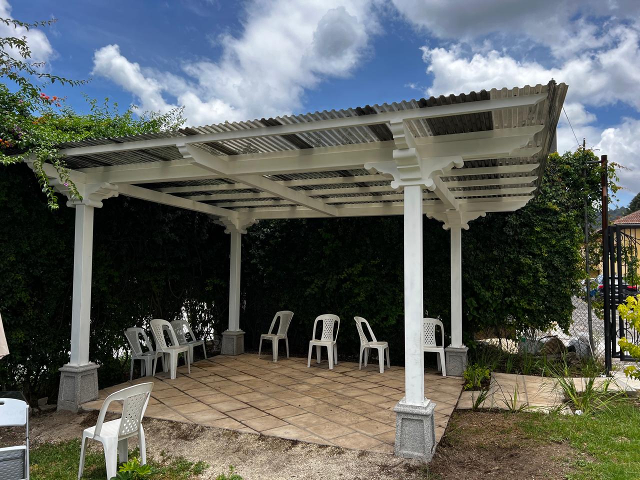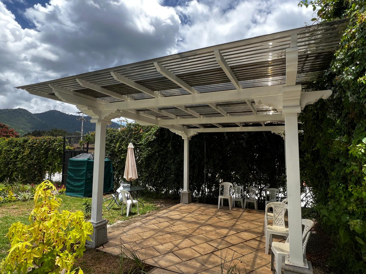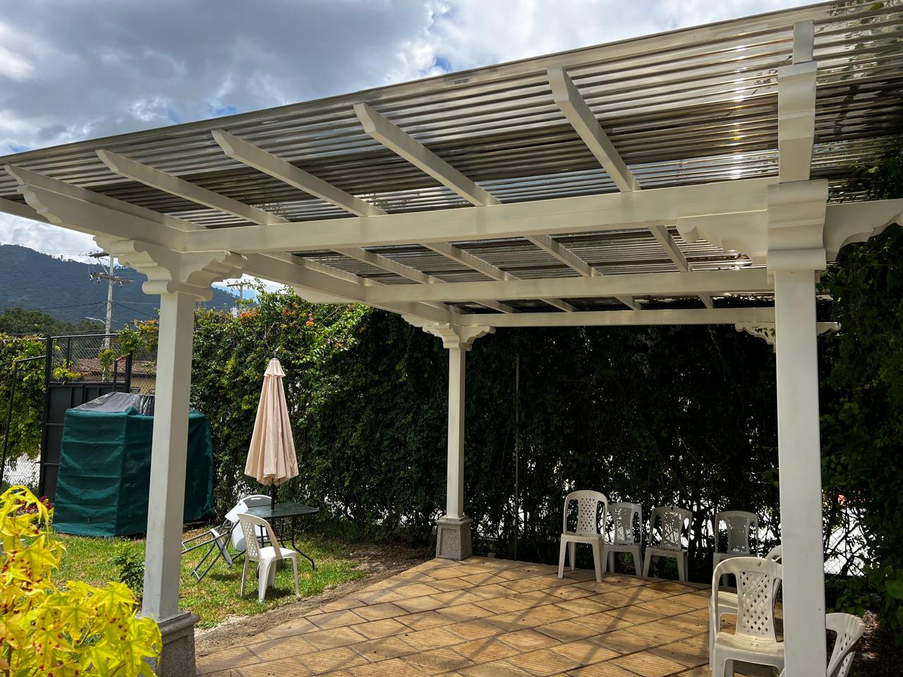 Pérgola elaborada 100% metal, simulando capiteles, zapatas y tendales de madera. Cuidamos meticulosamente nuestros detalles para entregar proyectos y productos que satisfagan las necesidades y expectativas de nuestros clientes. Esta pérgola exterior ofrece un diseño colonial espectacular utilizando tubos estructurales y lámina troquelada de policarbonato para el techo.
