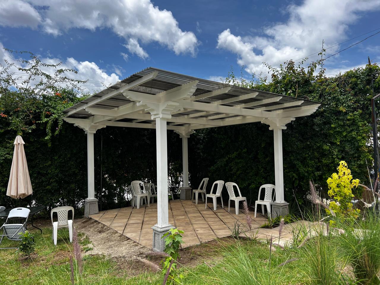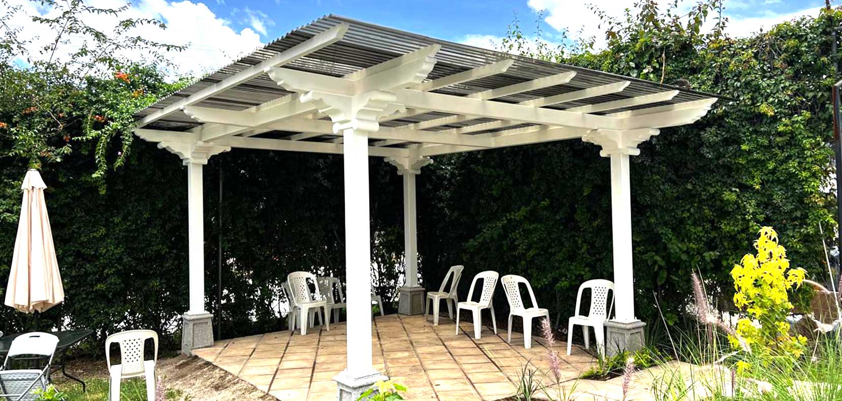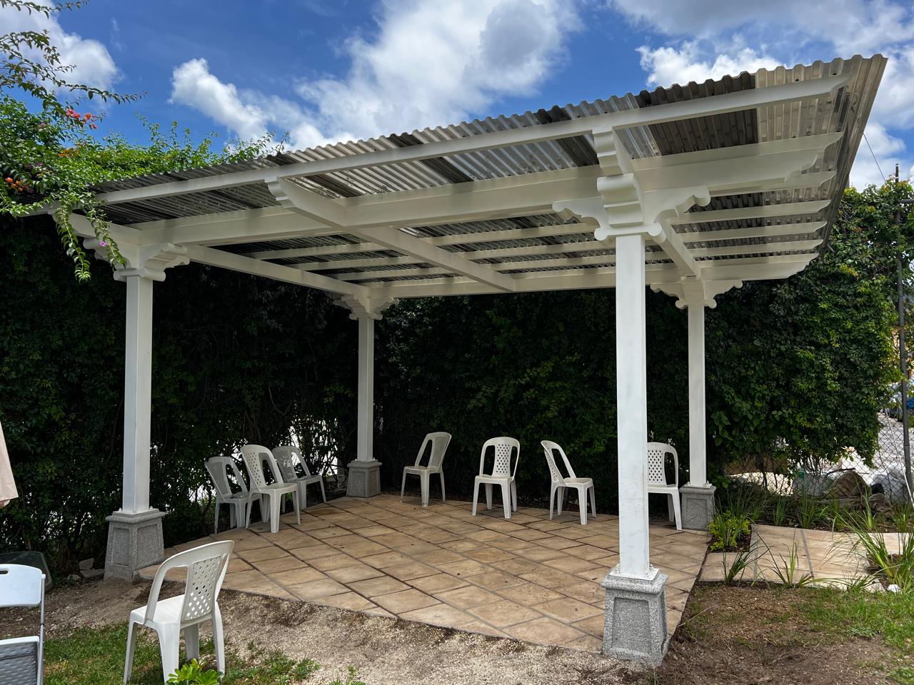 Pérgola elaborada 100% metal, simulando capiteles, zapatas y tendales de madera. Cuidamos meticulosamente nuestros detalles para entregar proyectos y productos que satisfagan las necesidades y expectativas de nuestros clientes. Esta pérgola exterior ofrece un diseño colonial espectacular utilizando tubos estructurales y lámina troquelada de policarbonato para el techo.