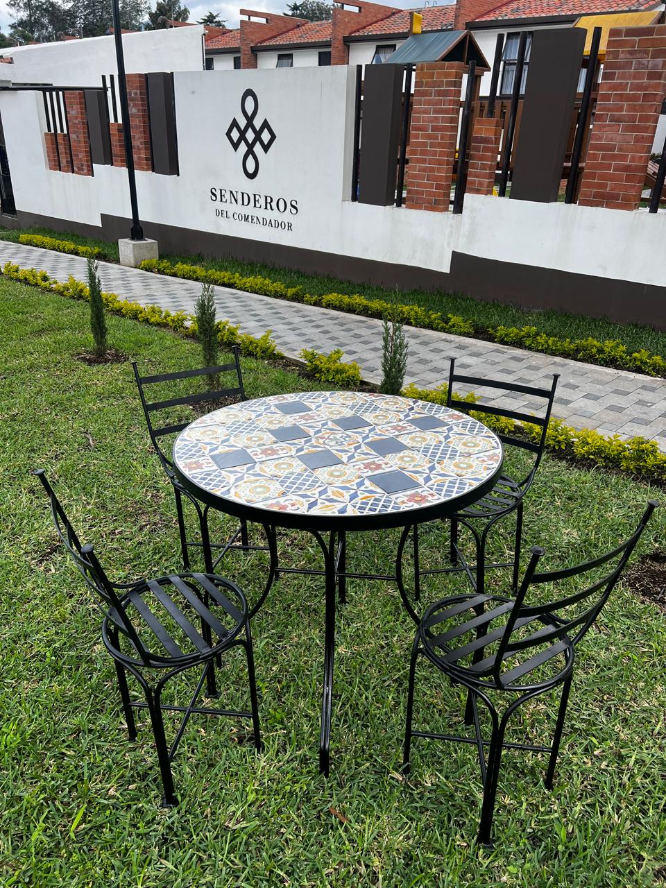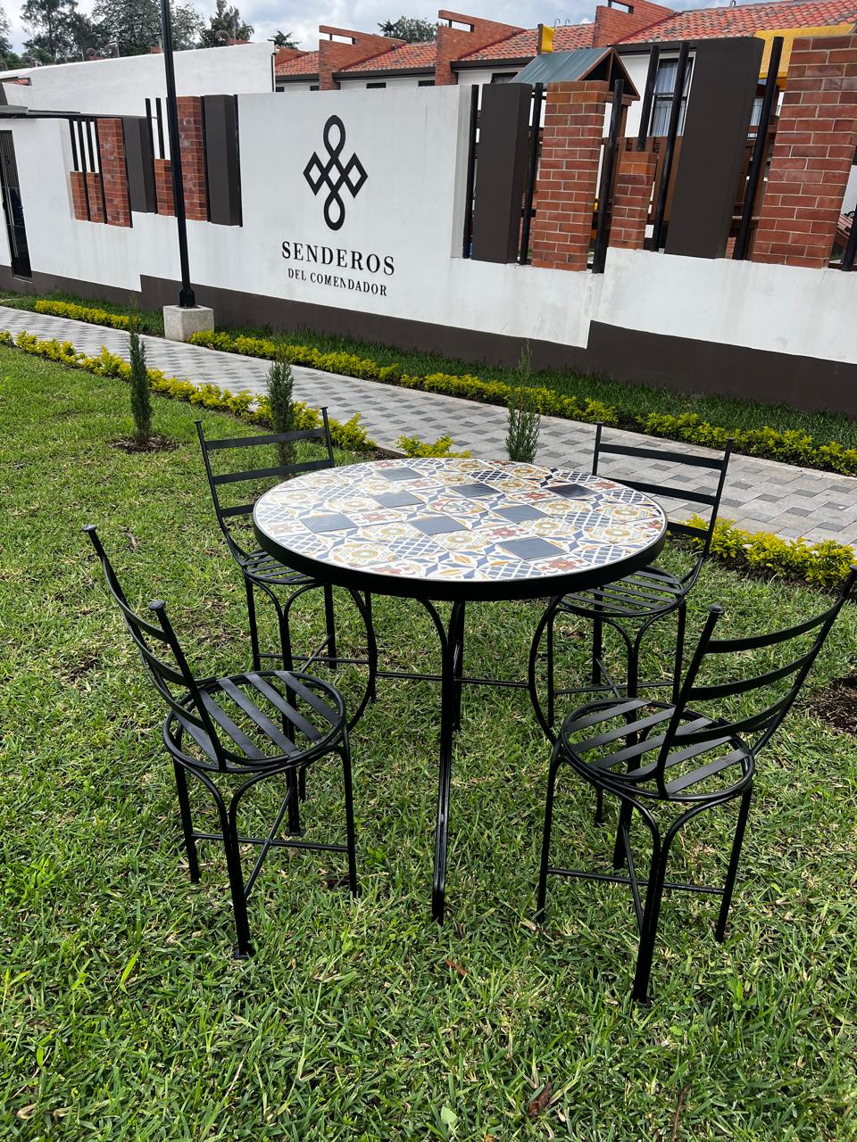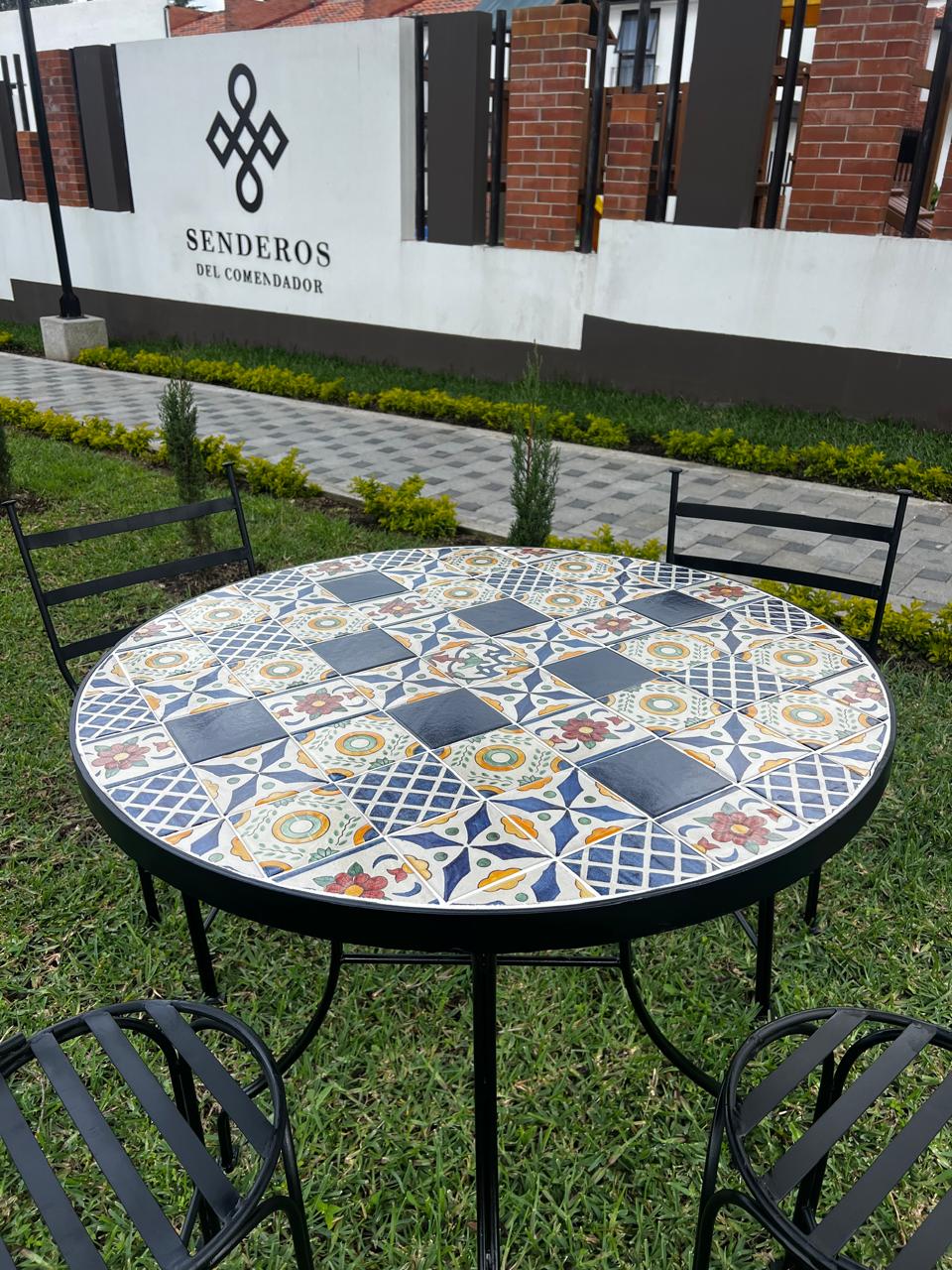 Hermosa mesa para 4 personas, elaborada con estructura de metal y top redondo de concreto con diseño cerámico artesanal tipo mosaico, acompañada de un set de cuatro sillas elaboradas también con hierro redondo. Ideal para acompañar y embellecer tu jardín o el espacio que más prefieras dentro de tu propiedad o proyecto.