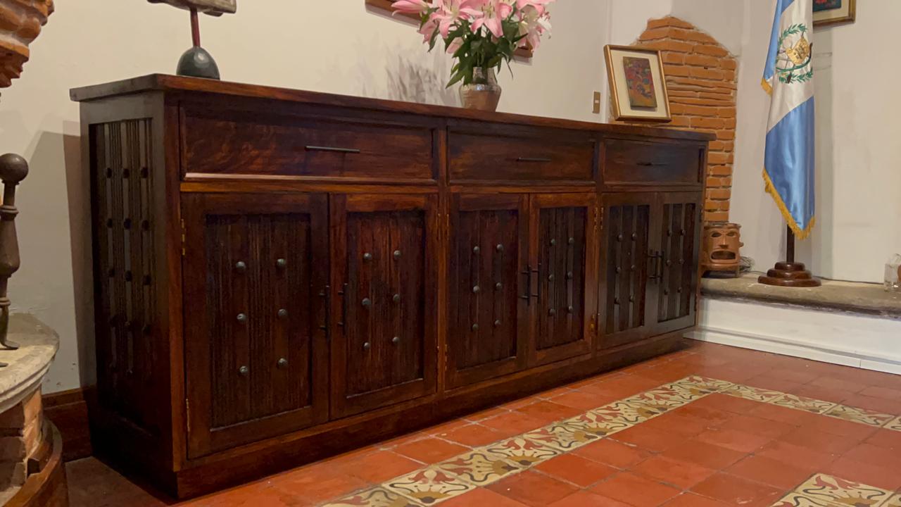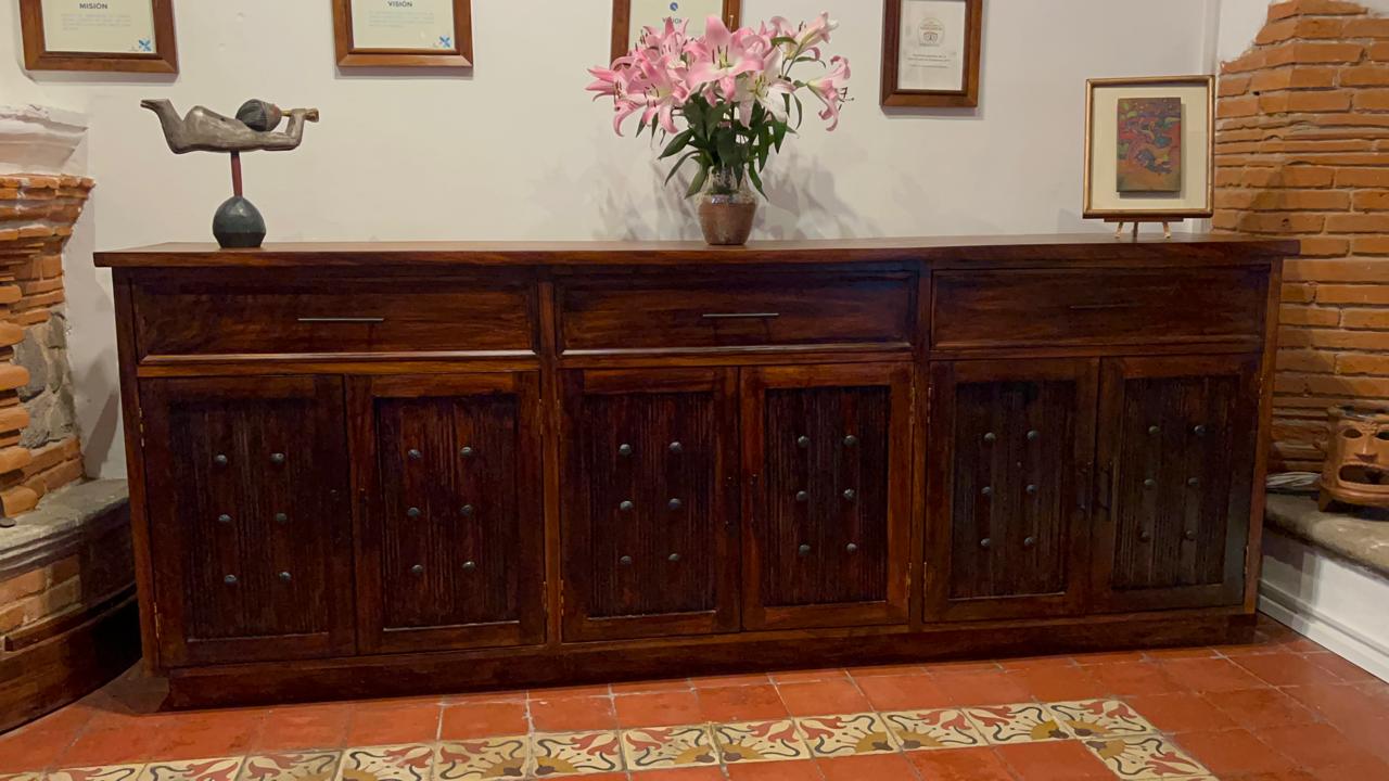 La madera de conacaste, el tinte nogal obscuro y el arte de nuestros carpinteros fusionados para crear esta espectacular tredenza. El detalle perfecto en la recepción de hotel de nuestro cliente. En Ironwood convertimos la madera en arte y tus ideas en realidad.